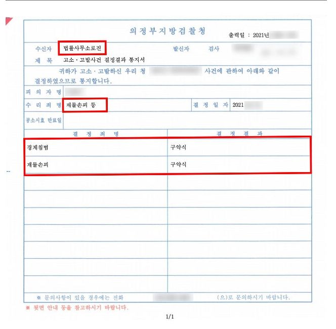 의정부지방검찰청은 변호사 의견을 그대로 받아들여 A씨에게 경계침범죄, 재물손괴죄에 대하여 구약식처분 결정을 하였습니다.