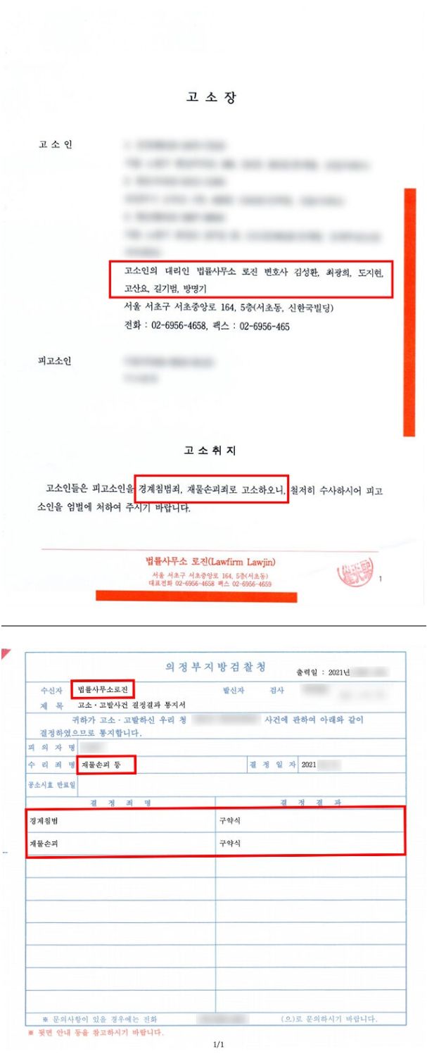 의정부지방검찰청은 로진의 변호사 의견을 그대로 받아들여 A씨에게 경계침범죄, 재물손괴죄에 대하여 구약식처분 결정을 하였습니다.