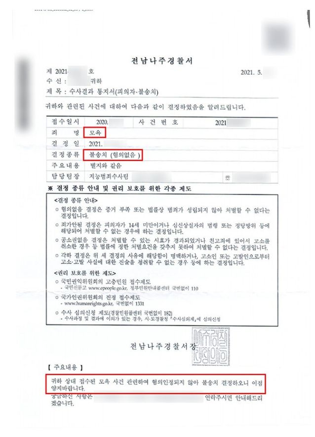 경찰은 형사전담팀의 변호인 의견서 내용을 전면적으로 인정하여 의뢰인의 사이버명예훼손 내지 모욕 혐의에 대해 ‘불송치'결정, 즉 무혐의 처분을 하였습니다.