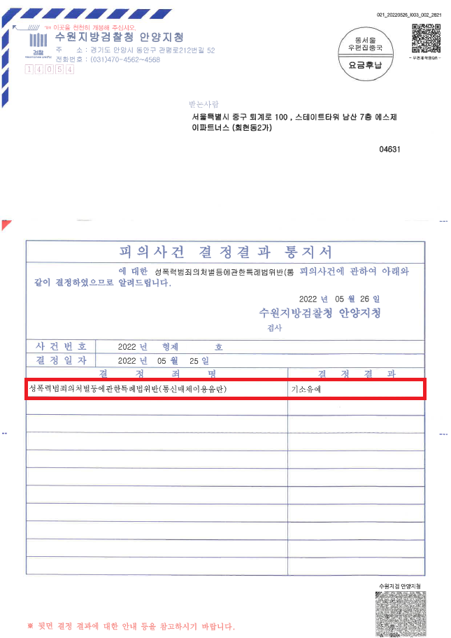 이러한 저의 조력을 바탕으로 A씨는 이미 기소유예 처분 전력이 있는 상황에서 B씨와 합의하지 않고 혐의를 적극 다투었음에도 불구하고 아무 조건도 없는 '기소유예' 처분을 받음으로써 법적 불이익을 최소화하면서 성범죄 전과자가 될 위기에서 벗어날 수 있었습니다.
