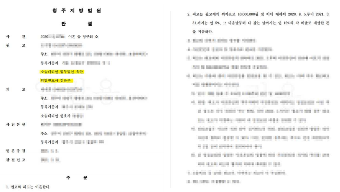 저는 의뢰인이 상대방의 도박벽으로 인하여 받았을 정신적 고통의 정도가 말로 표현할 수 없을 정도로 심하다는 점, 이로 인해 의뢰인과 상대방의 혼인생활이 파탄에 이르렀다는 점을 재판부에 강하게 어필하였습니다.