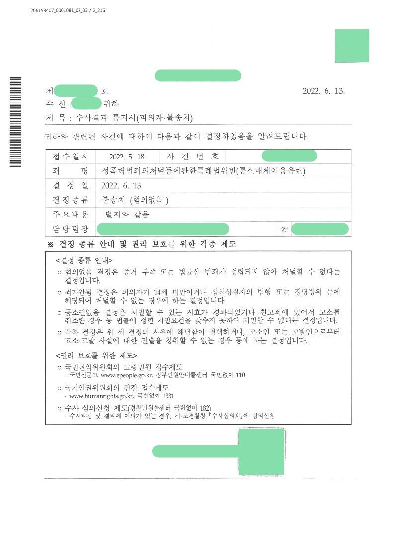 합의없이 최종 불송치(혐의없음)라는