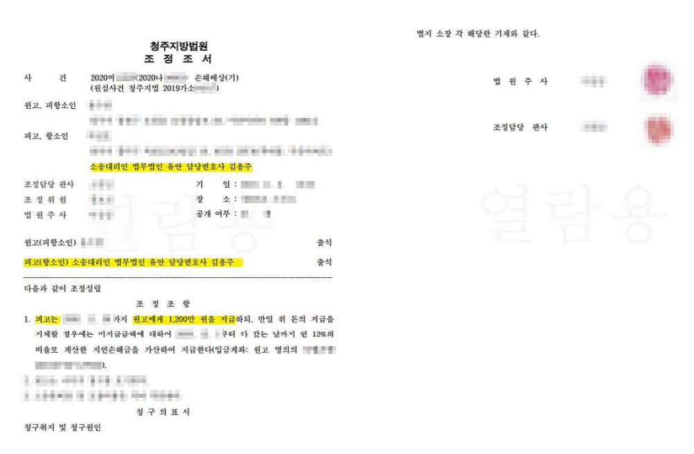 위와 같은 주장이 재판 과정에 잘 반영되었고 결국 의뢰인은 상대방의 청구 금액에서 60% 감액된 금액만을 상대방에게 지급하는 것으로 정리가 되었습니다.