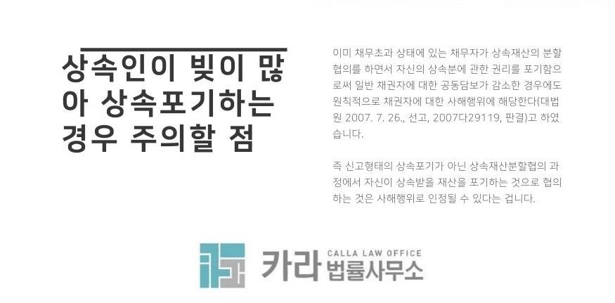 이처럼 채무관계가 얽혀있는 경우, 상속포기 절차를 잘못했다가 공동상속인에게 분할되어야 할 상속재산까지 침해 보는 사례가 발생할 수 있으므로 가급적 상속 절차는 법률대리인을 통해 채무상황과 재산상황을 꼼꼼히 따지고 이에 따른 법적 절차를 깔끔하게 마무리하는 것이 중요합니다.