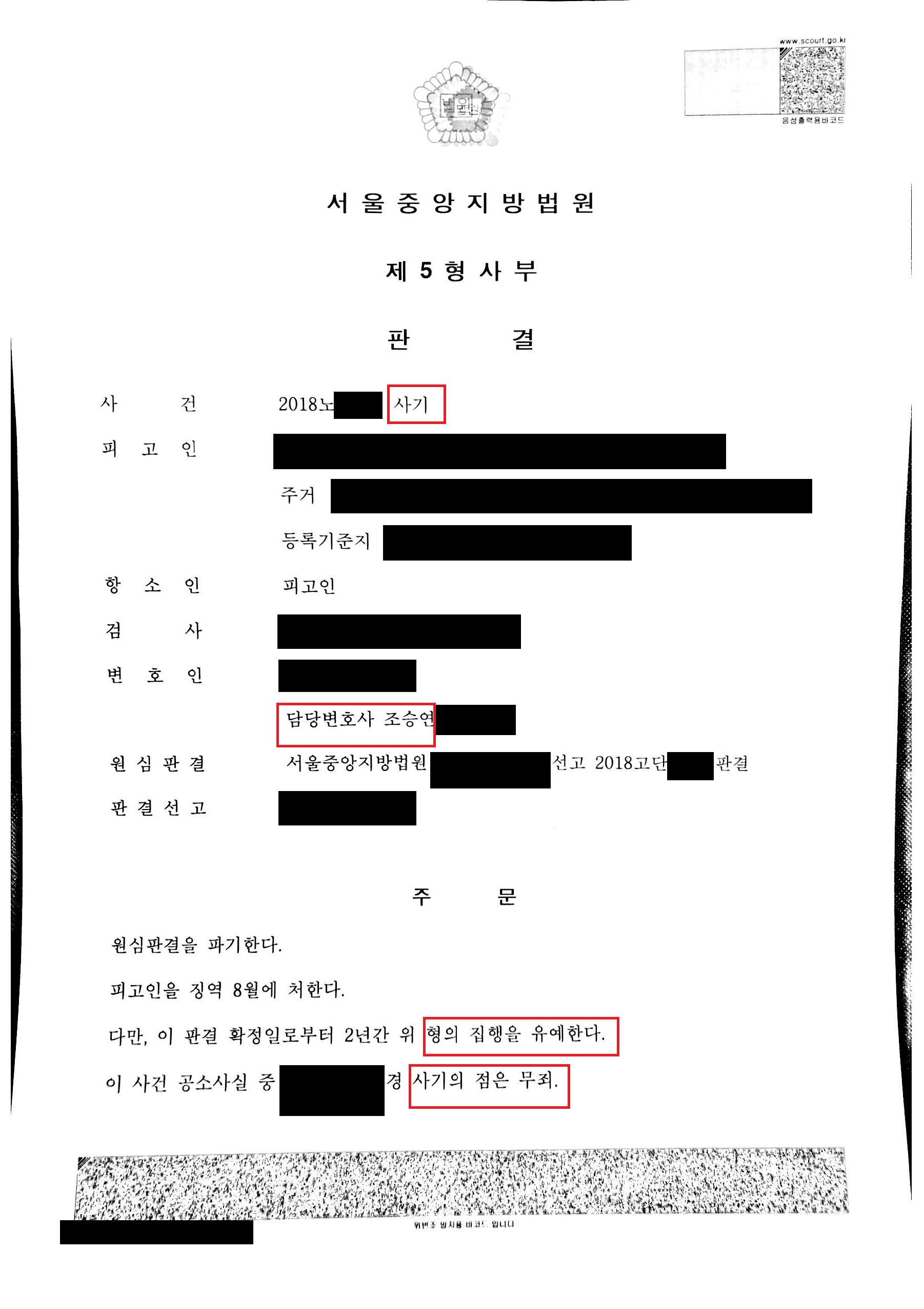 항소심에서 일부 무죄, 징역 8월, 집행유예 2년이라는