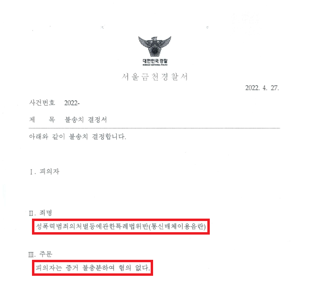 이러한 저의 조력을 바탕으로 A씨는 전혀 모르는 여성에게 다짜고짜 성적 채팅을 전송하고 아무 반응이 없자 약 1주일 뒤에는 성기 사진을 전송하였음에도 불구하고 '불송치(혐의없음)' 결정을 받음으로써 성범죄자가 될 위기에서 벗어날 수 있었습니다.