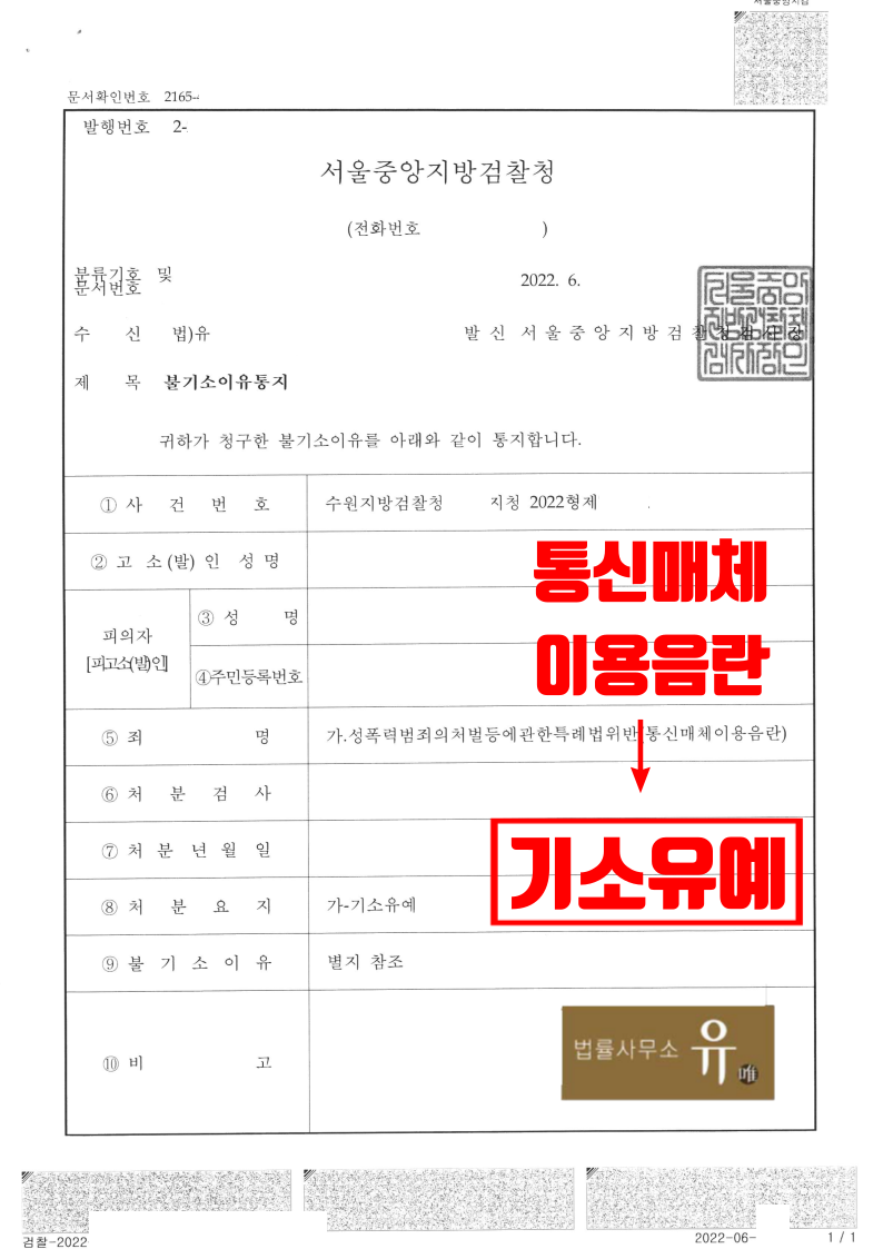 수원지방검찰청 안양지청은 법률사무소 유(唯)의 형사전문변호사가 작성한 변호인의견서의 내용을 그대로 받아들여 피해자가 깊이 뉘우치고 반성하고 있는 점, 피해자와 원만히 합의에 이른 점 등을 이유로 의뢰인에게 기소유예 처분을 하였습니다.