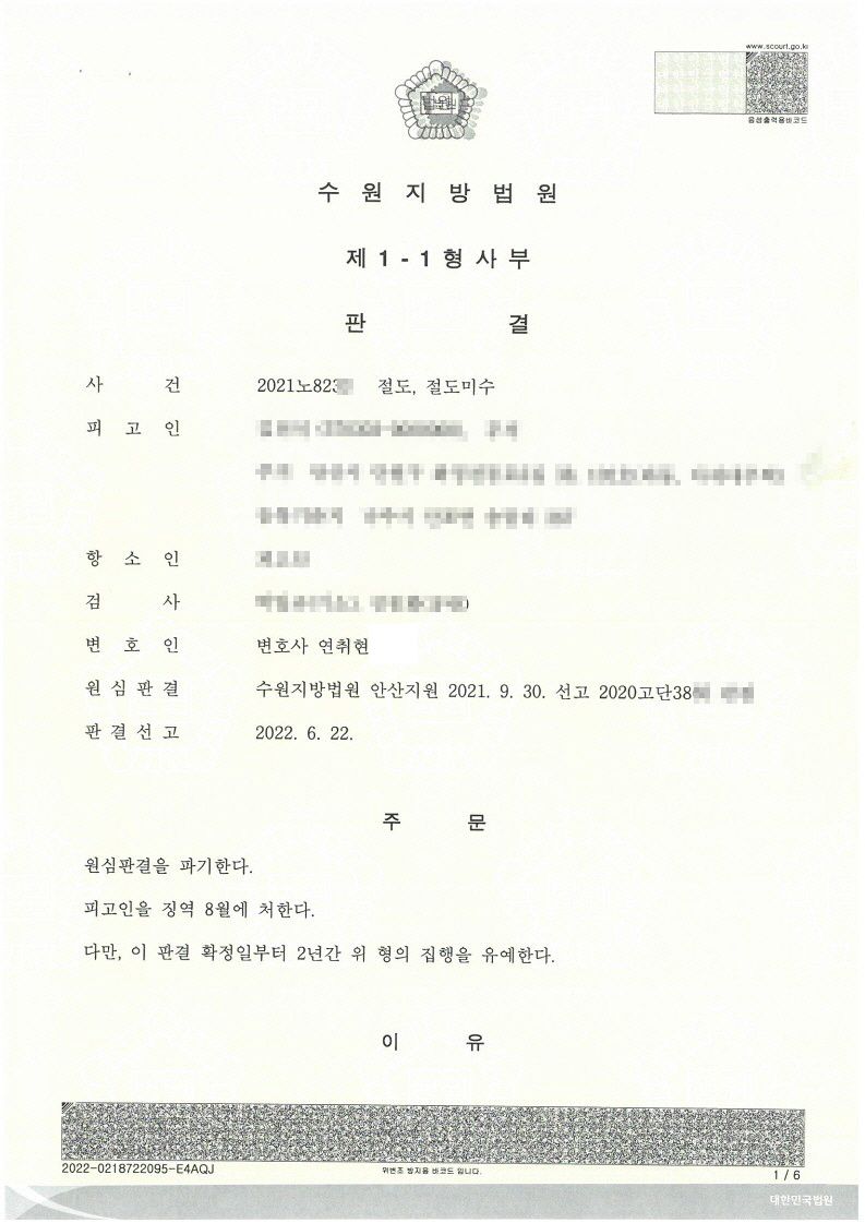 본 변호인은 의뢰인과 접견 후 의뢰인이 정상적인 상태에서 행한 범죄가 아님을 확인하고 의뢰인의 의료기록을 확보하기 위하여 의료기록송부촉탁을 통하여 의뢰인이 17여년전부터 알콜의존증 및 정신적 문제를 치료받아 오고 있었다는 사실을 확인하였습니다. 이에 재판부에 의뢰인의 심신미약을 인정받아 원심의 형을 파기하고 징역 8월에 집행유에 2년의 판결을 이끌어냈습니다.