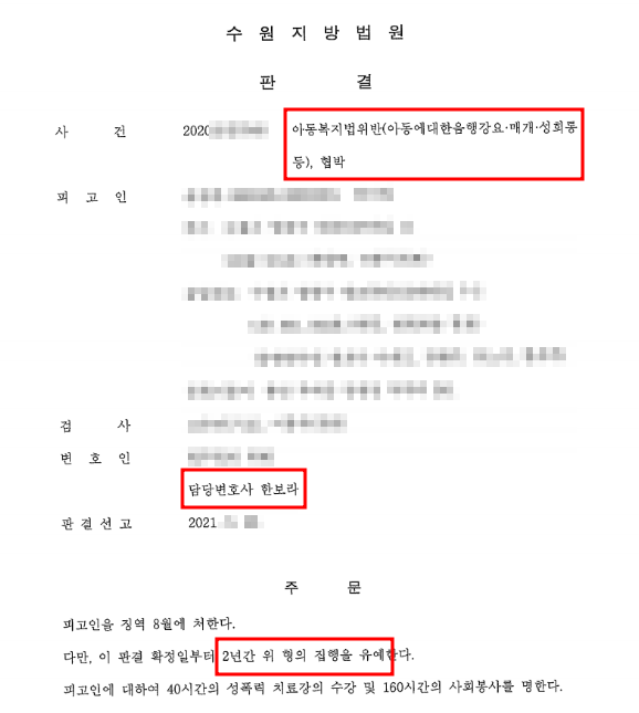 위와 같은 한보라 변호사의 주장을 받아들인 검찰은 의뢰인의 행위를 ‘폭행이나 협박으로 아동청소년으로 하여금 아동청소년의 성을 사는 행위의 상대방이 되게 하는 것’의 미수가 아닌 협박 및 아동복지법위반으로만 구공판하였으며, 법원은 의뢰인의 각종 유리한 정상을 감안하여 의뢰인에게 “징역 8월에 집행유예 2년”을 선고하면서 신상공개명령, 고지명령 및 취업제한은 면제하였습니다.