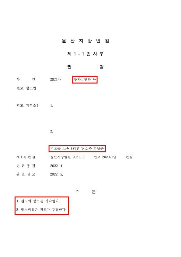 울산지방법원에서는 ‘항소기각’이라는 판결을 하였고, 그 결과 의뢰인님께서는 1심 에 이어 2심도 승소하였습니다.