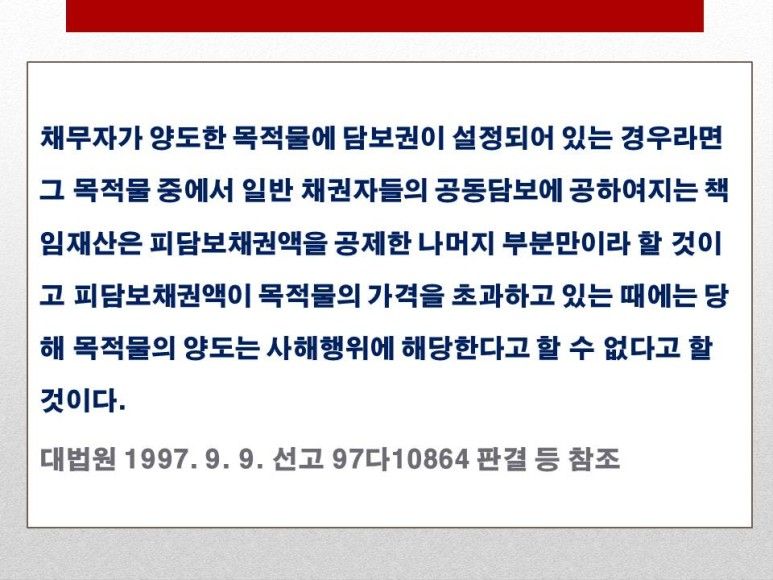 ① 근저당권이 설정되어 있는 부동산이 사해행위로 양도되었다고 하더라도 피담보채권액을 공제한 나머지 부분이 책임재산에 해당하고, 피담보액이 부동산의 시가를 초과한다면 양도를 했다 하더라도 사해행위가 아닙니다.