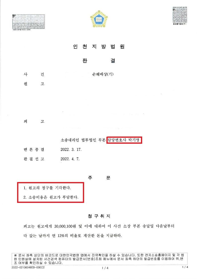이에 법원에서도 피고(의뢰인)가 상대방(원고측 남편)이 혼인관계에 있음에도 서로 만났다는 점에 대하여 증거가 없으므로 피고(의뢰인)에게 승소판결을 선고 하였습니다.