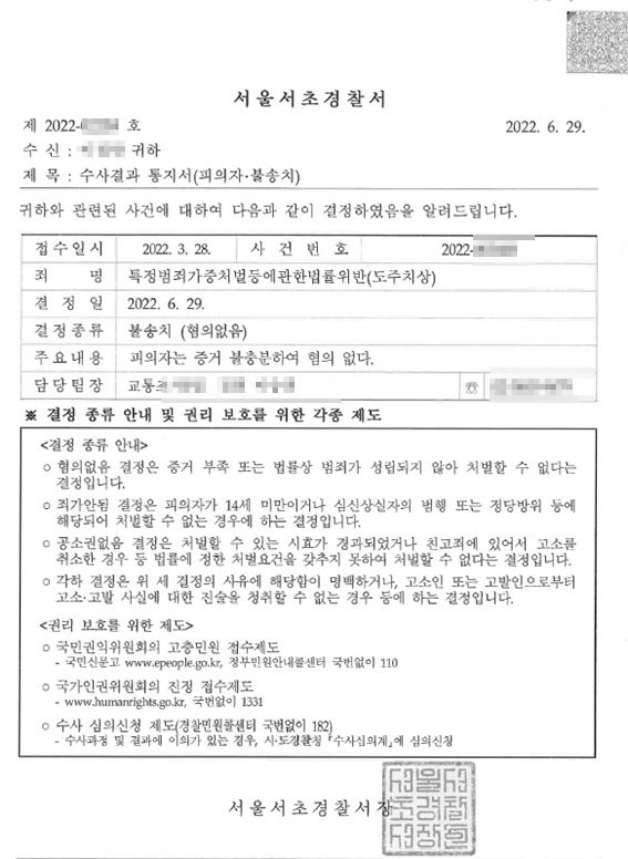 이 사건을 수사한 서울서초경찰서는 의뢰인을 불송치(혐의없음) 처분하였습니다.