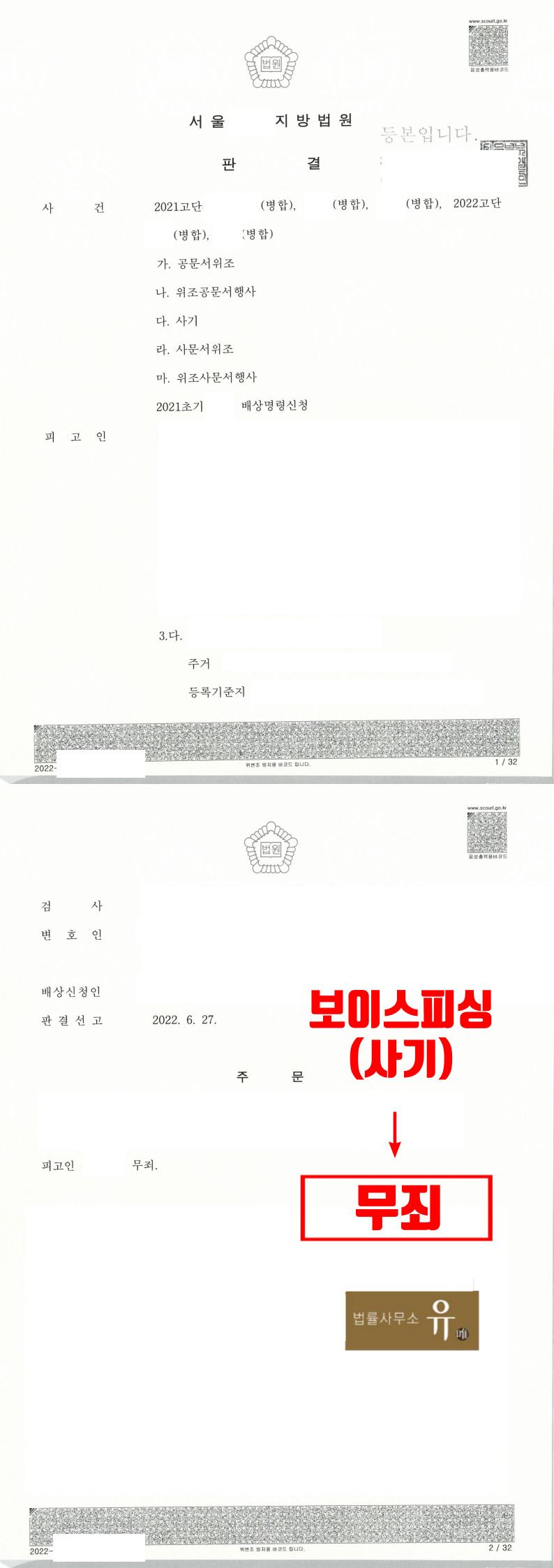 법률사무소 유(唯)의 형사전문변호사는, 의뢰인과의 미팅은 물론 공소장 등의 분석을 통해 의뢰인이 보이스피싱이라는 사실을 전혀 인지하지 못한 상태에서 일을 하였다는 사실을 파악한 후 공판과정에서 의뢰인과 함께 기소된 공동피고인을 증인신문하여 의뢰인은 단지 차가 없어 이동하기 힘들어하는 공동피고인을 위해 차량을 운전해 준 사실밖에 없다는 증언을 이끌어 내는 한편, 의뢰인이 보이스피싱이라는 점을 알게 된 직후 이마저도 바로 그만두었다는 사정을 최대한 상세하게 작성한 변호인의견서를 관련 판례 및 양형자료와 함께 제출하였습니다.