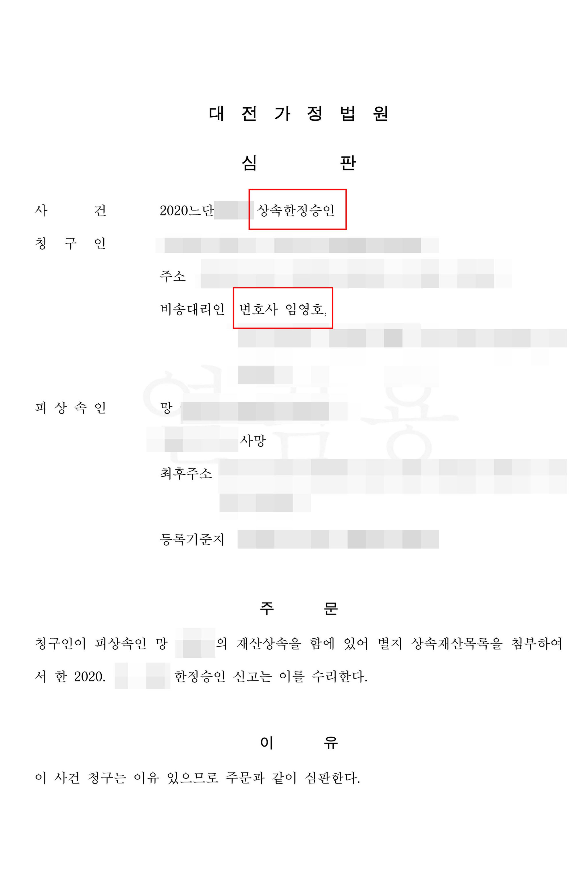 그 결과 의뢰인의 경우 한정승인이 훨씬 유리하였기에 한정승인을 신청하는 것으로 결정하고, 상속재산 목록을 작성하고 신청서를 첨부하여 망자의 초본상 최후 주소지 관할법원에 한정승인 심판청구를 접수하였습니다.