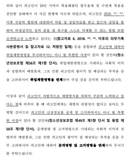 나아가, 변호인은 변론 종결 후 판결 선고 전에도 변론요지서를 제출하여 '의뢰인에게 금고 이상의 형의 집행유예 내지 선고유예라도 선고될 경우 의뢰인께서 공황장애 및 불면증에 시달리는 와중에도 정상적인 생활을 영위하고자 끊임없이 노력한 결과 어렵사리 얻은 첫 직장을 잃을 수도 있다는 점'을 다시 한 번 강조하는 동시에 취업제한명령 등 부수처분을 면제하여 주실 것을 간청하였습니다.
