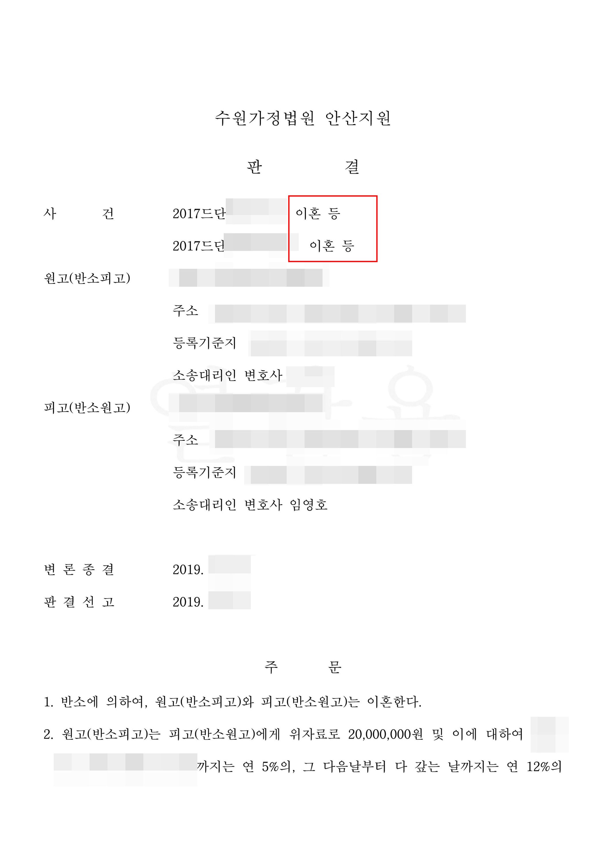 이번 사건은 남편이 아내(의뢰인)를 상대로 자기를 무시한다며 먼저 이혼청구를 하였으나, 아내쪽에서 남편의 부정행위와 폭력을 이유로 반소를 제기하여 남편의 청구는 기각되고 오히려 의뢰인의 청구가 인정된 사안입니다.