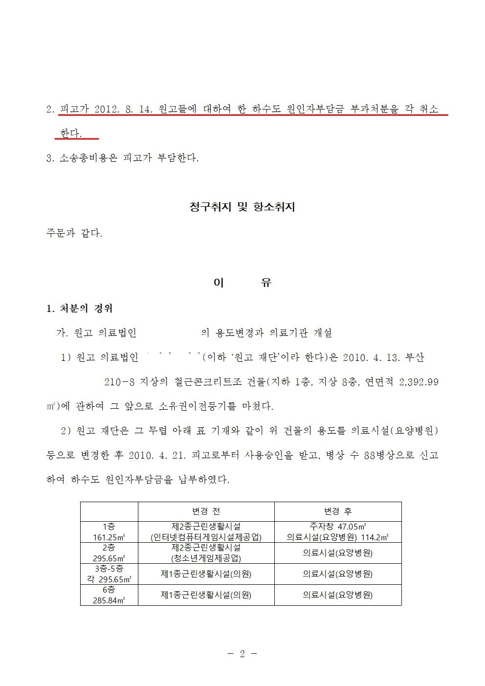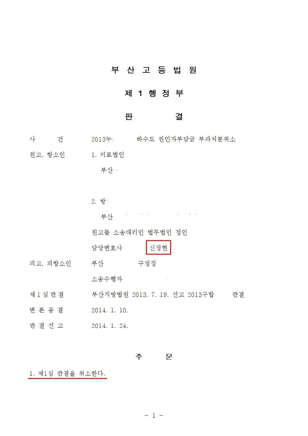 결국 '병상수'를 기준으로 하수도 원인자 부담금을 부과하는 것이 위법하다는 내용으로 법원을 설득하였고, 1심판결의 내용을 뒤집고, 결국 항소심에서 해당 부담금 부과처분을 취소하는 판결을 이끌어 냈습니다.