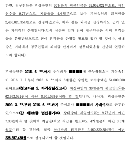 청구인들 소송대리인은 노무법인의 의견서까지 첨부하여 '의뢰인과 피상속인이 공동으로 운영하던 회사에 대해 피상속인이 약 25억 원의 퇴직금 채권 및 약 5억 원의 가수금 채권을 갖고 있었다'고 주장하였습니다. 이에, 본 변호사는 의뢰인과 피상속인이 공동 운영하던 회사의 임원퇴직금규정과 재무제표 등을 분석하여 피상속인의 회사에 대한 퇴직금 채권 및 가수금 채권이 존재하지 않음을 주장, 입증하였습니다.