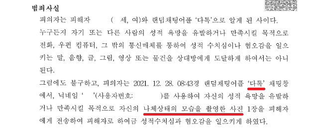 A씨는 2021. 12. 28.경 여느 때와 마찬가지로 '다톡'을 하던 중, 여성 B씨에게 다짜고짜 나체 사진을 전송하였습니다.