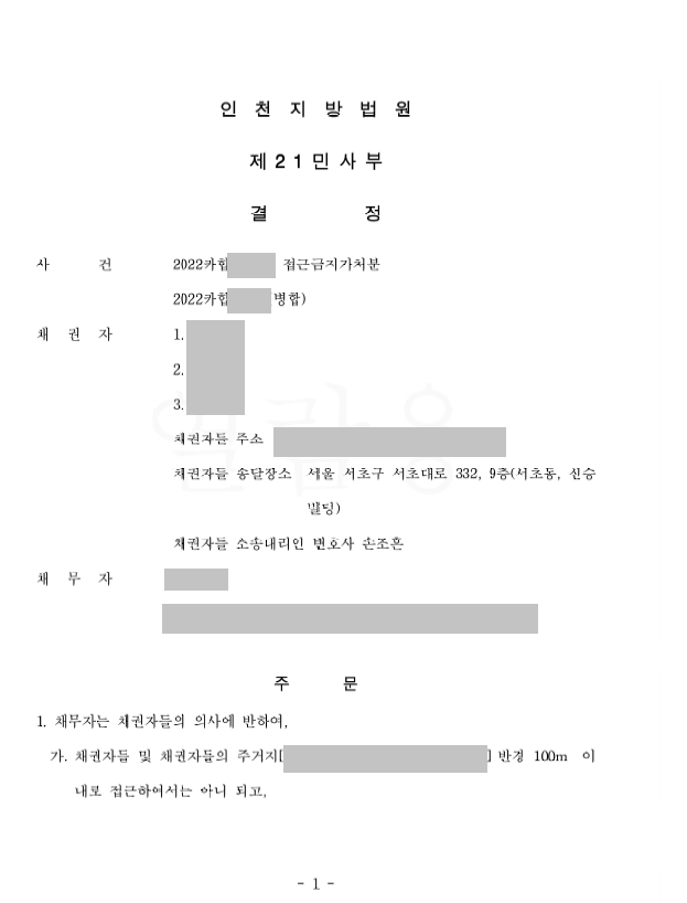 의뢰인들은 이미 이혼한 남편/아버지의 거듭된 폭력적 행위로 인하여 일상생활의 상당한 지장을 받게 되었고, 이에 손조흔 변호사를 찾아와 상대방이 접근과 연락을 하지 않기를 희망한다고 하였습니다.