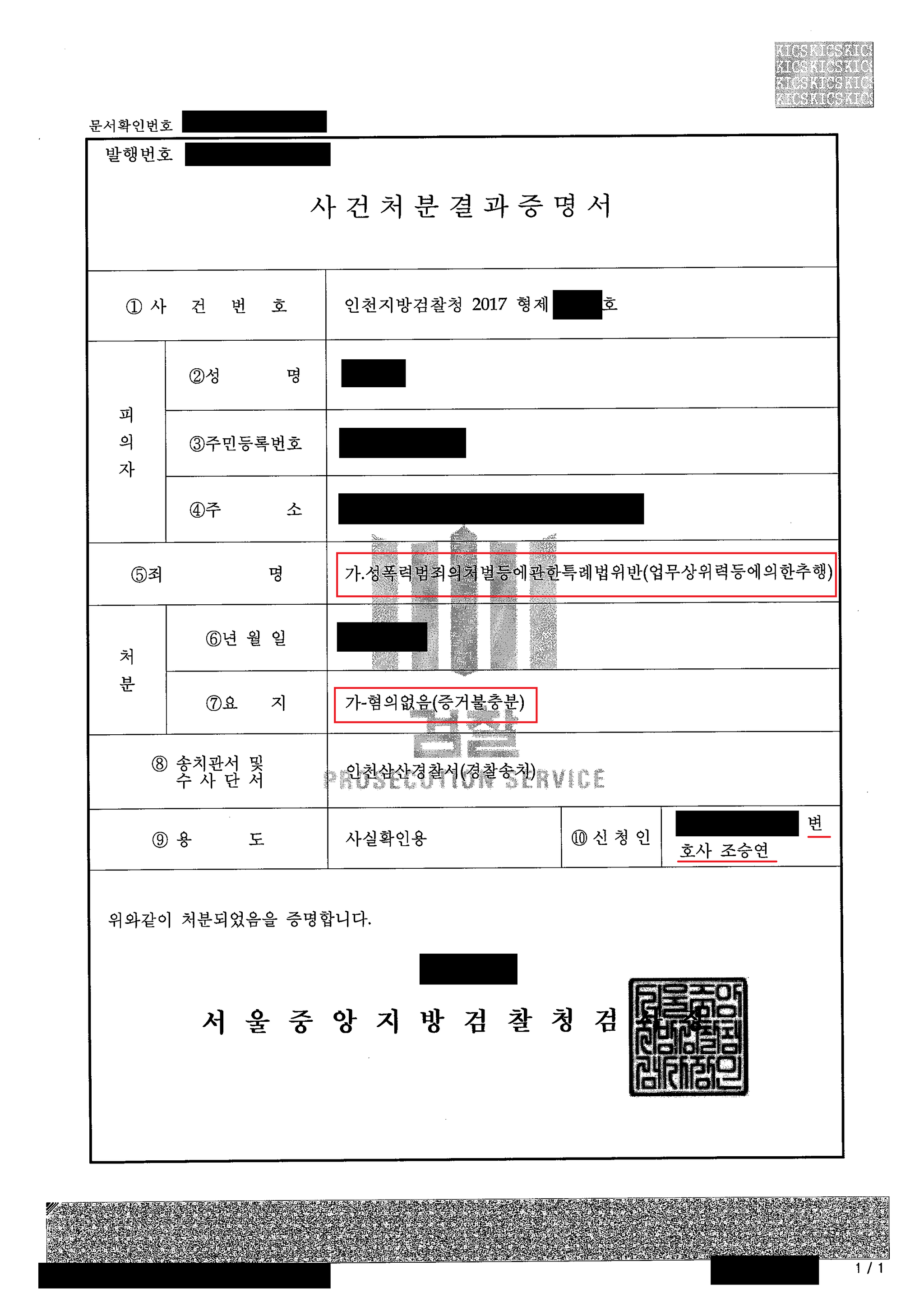 위 이유들로 인하여 검찰에서는 의뢰인이 B 술집에서 술을 마시던 중 고소인의 허벅지와 가슴을 만진 것은 인정되나, 고소인을 강제로 추행하거나 업무상 위력에 의하여 추행한 것으로 보여진다고 판단할 증거자료가 없다는 결론을 내렸습니다.