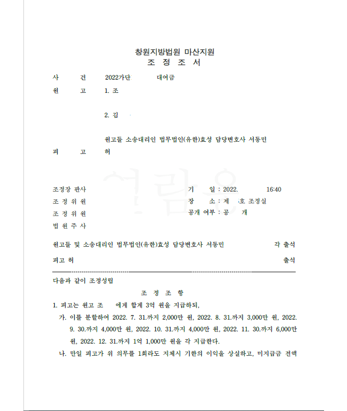 저는 즉각 피고를 상대로 대여금청구소송을 제기하였고 피고가 변제하겠다는 의사를 표하자 신속하게 대여금을 받기 위해 재판부에 조정을 요청하였습니다. 조정에서 의뢰인들은 소액을 감액해주고 대여금 거의 전부를 받아내는 조정을 성립하였습니다.