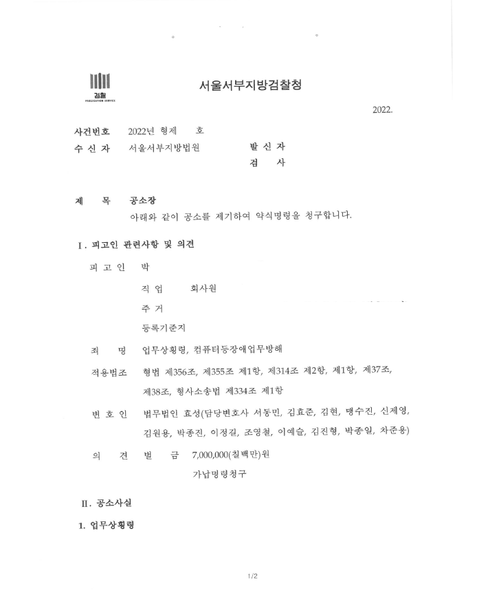 저는 즉각 검사에게 피해 금액이 고소인이 주장하는 금액이 아니라 그 1/10 정도에 그친다는 점, 위 금액을 고소인에게 지급한 점 등을 중점적으로 주장 입증하였고 검사는 벌금형의 약식기소를 하여 확정되었습니다.