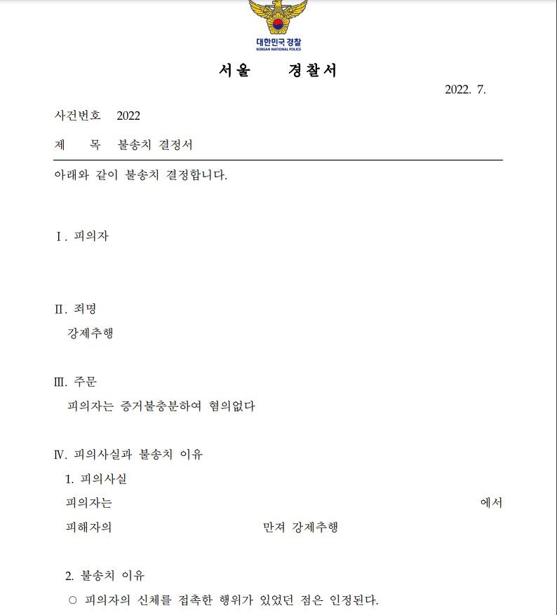 제가 선임된 이후 이 사건 사실관계들을 위에서 말씀드린 여러 요소와 관점에서 고려하여 이 사건에서 문제되는 신체접촉이 객관적으로 일반인에게 성적 수치심이나 혐오감을 일으키게 하고 선량한 성적 도덕관념에 반하는 행위로 볼 수 없다는 점을 충분히 소명하고 입증하였으며, 좋은 결과를 이끌어낼 수 있었습니다. 신체접촉은 있었지만 강제추행에 해당되지 않는다는 점을 소명하고 입증해야했기 때문에 참으로 어려운 사건이었습니다만, 참 다행히도 담당 경찰 수사관님께서 사실관계들과 강제추행의 법리를 종합적으로 검토하고 판단해주시어 좋은 결과가 나올 수 있었습니다.