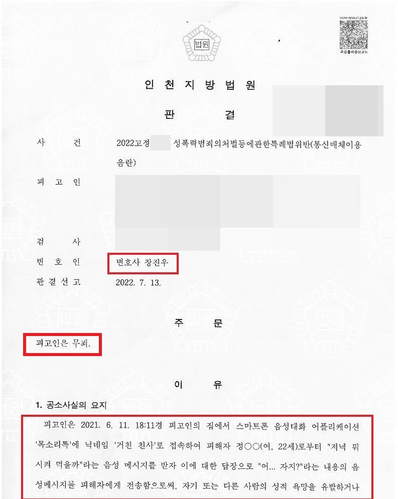![[통매음_무죄] 목소리톡에서 성기를 언급하여 고소당한 사례](/_next/image?url=https%3A%2F%2Fd2ai3ajp99ywjy.cloudfront.net%2Fuploads%2Ftitleimage%2Foriginal%2F5b8784b761e21bdb25a45a33-original.jpg&w=3840&q=75)