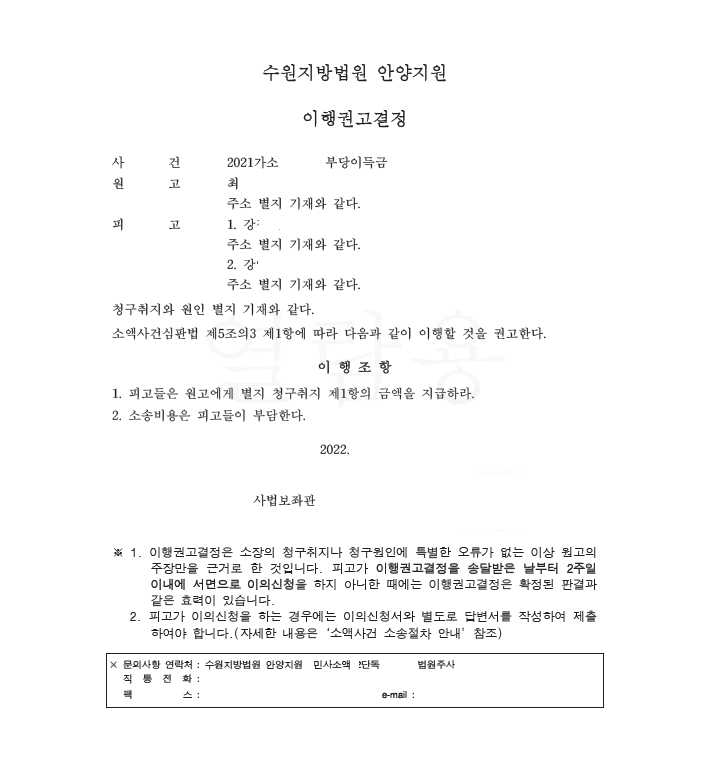 저는 즉각 입금 받은 자들을 피고로 하여 민사소송 부당이득반환청구소송을 제기하였고 법원은 저희의 주장을 모두 받아들여 이행권고결정을 내렸고 피고들은 이의하지 않아 확정되어 의뢰인은 피해액을 반환받게 되었습니다.