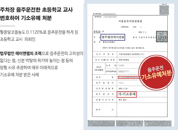 기소유예 처분은 ‘특별한 사유가 있는 경우’에 한하여 내려집니다. 이 사건의 경우 앞서 언급한대로 음주측정을 통해 수치가 측정되었고, 실제 운전대를 잡았음에도 불구하고 에이앤랩의 전문성 넘치는 조력으로 이 사건 음주운전이 특별한 사유가 있는 경우에 해당한다는 점을 잘 입증함으로써 기소유예라는 결과를 얻어낸 것은 물론, 공무원 신분으로 징계위기에 놓인 의뢰인의 신분을 유지할 수 있도록 한 매우 의미있는 사례라 할 수 있습니다.