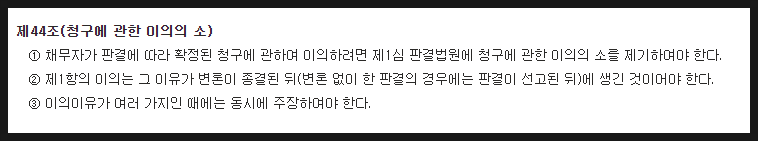 이러한 경우 통상적인 민사사송이나 항소를 통하여 권리구제를 받을 수는 없으나 ■ “청구이이의소”라는 소송절차를 통해 문제를 해결할 기회를 부여받을 수 있는데, 이렇게 채권자가 집행권원을 취득한 이후에도 구제가 가능한 이유는 확정된 지급명령이나 이행권고결정은 민사소송의 확정판결과 달리 집행력만 부여받고 기판력은 부여받지 못하기 때문입니다.