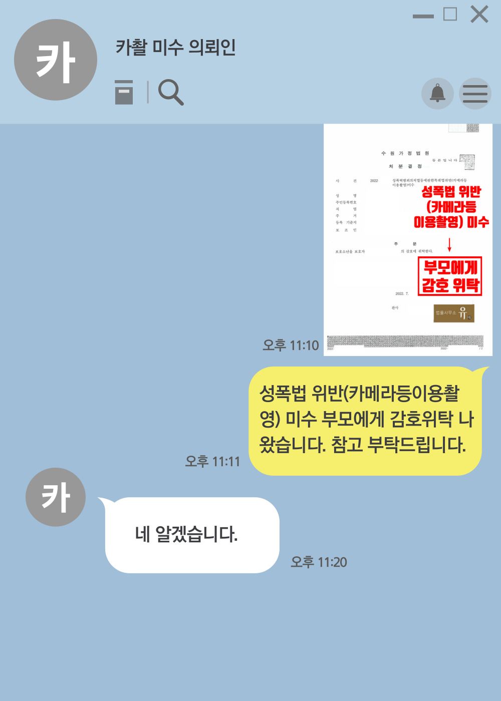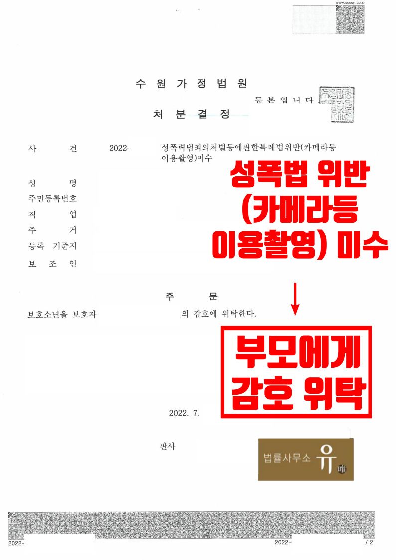 수원가정법원은 법률사무소 유(唯) 형사전문변호사의 변호인의견서 등을 참작하여 의뢰인에게 소년법상 가장 가벼운 1호 처분(부모에게 감호위탁)을 내렸습니다.
