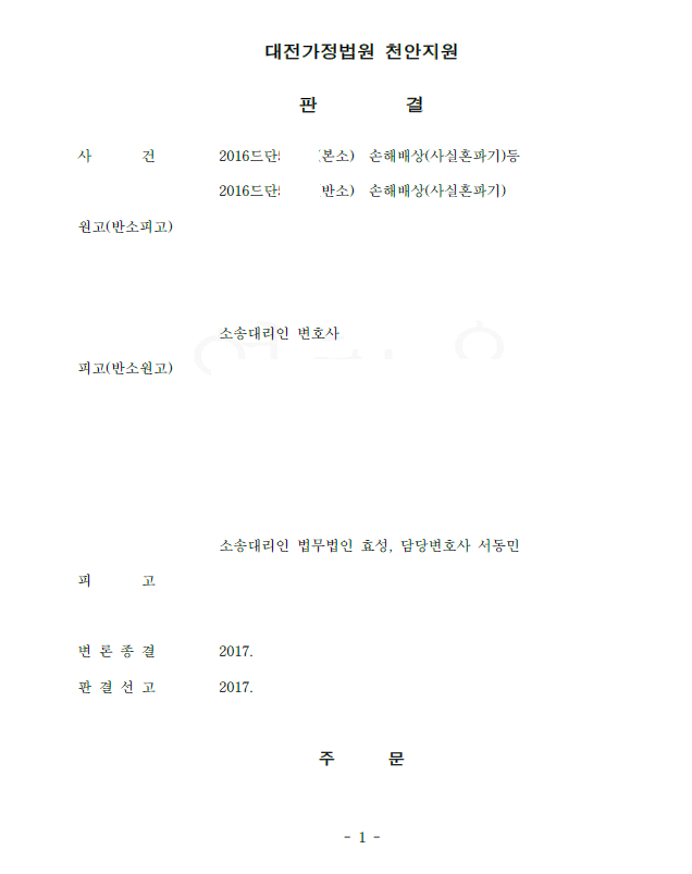 저는 의뢰인이 부정행위(바람)를 하지 않은 점, 결혼생활 내내 폭언, 폭행을 가한 것은 오히려 상대방인 점, 상대방이 실제로 의뢰인을 폭행하여 형사고소하여 상대방이 처벌받은 점 등을 적극적으로 주장 입증하여 상대방의 위자료청구를 기각시키고 의뢰인의 위자료청구는 인용되었습니다.