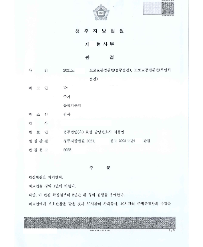 의뢰인은 기존 3번의 음주운전 처벌 전력이 있음에도 또 다시 음주운전 및 무면허운전을 하여 입건되었고 즉시 저에게 의뢰하였습니다. 의뢰인은 3번째 음주운전 적발 때 집행유예를 받아 구속 및 실형의 위험성이 큰 상태였습니다.