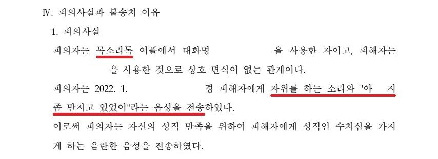 A씨는 2022. 1.경 여느 때와 마찬가지로 '목소리톡'을 하던 중 전혀 모르는 여성 B의 메아리에 자위를 하는 소리와 "아 ○지 좀 만지고 있었어"라는 답변을 하였습니다.