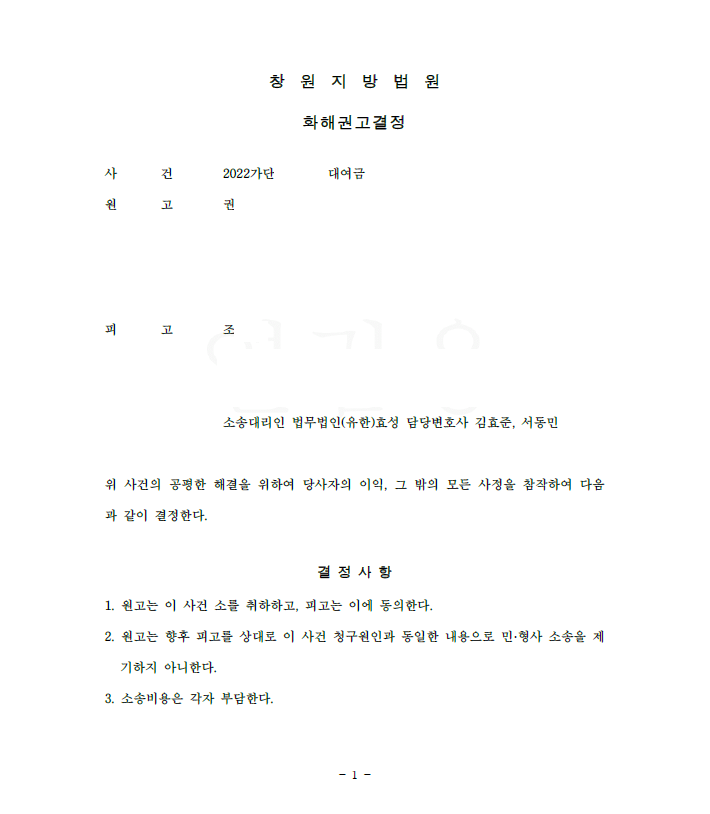 저는 즉각 의뢰인은 단순 소개자에 불과하므로 채무자가 아닌 점, 연대보증의사가 없었던 점, 원금보장약정 역시 없었던 점을 주장 입증하였고 법원은 원고의 소를 취하하며 원고는 다시는 동일한 소송을 제기하지 못하게 하는 화해권고결정을 내려 확정되었습니다.