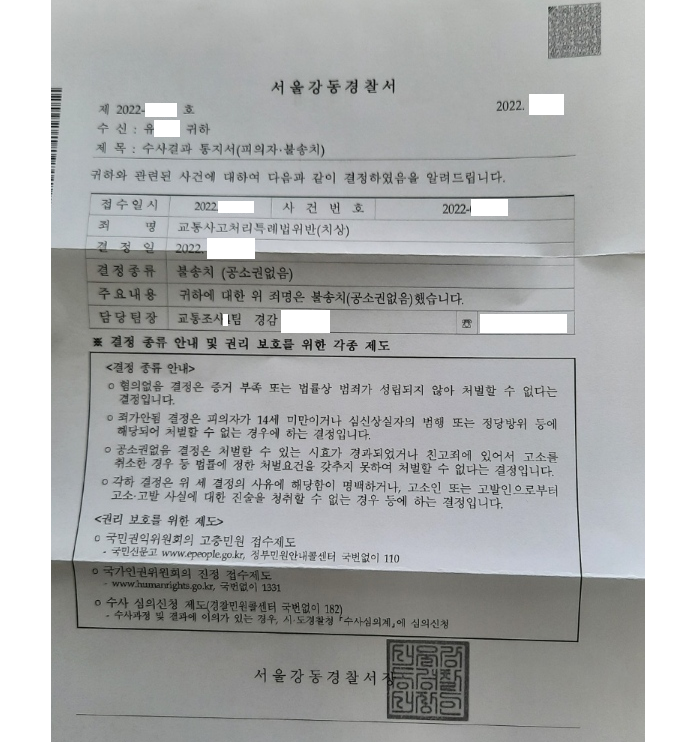 저는 즉각 경찰 조사부터 동석하여 조사를 받고 피해자 측과 연락하여 사죄를 구하고 신속히 합의를 하여 합의서를 경찰에 제출하였습니다. 경찰은 공소권없음 불송치결정을 하여 사건이 조기에 마무리되었습니다.