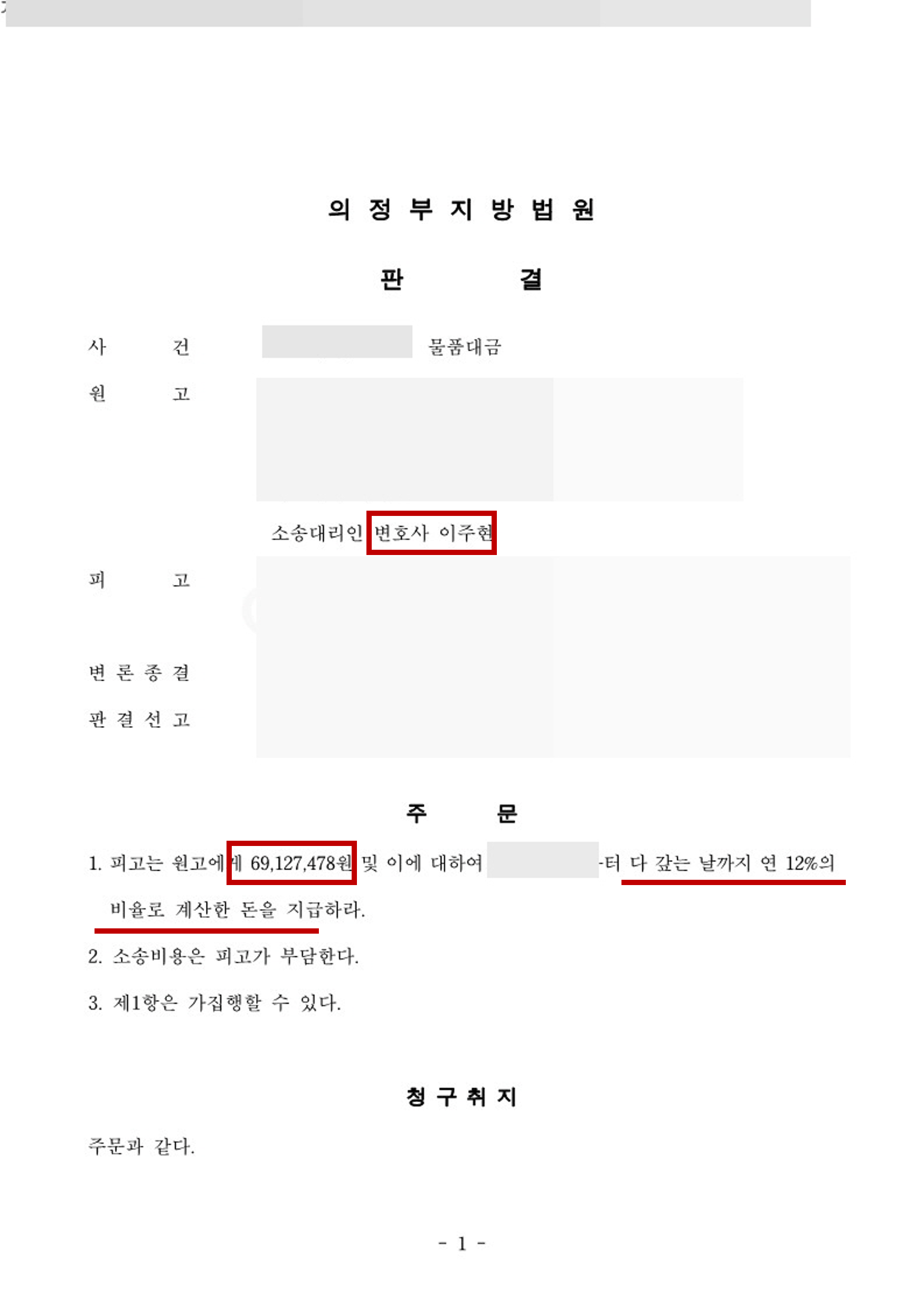 채권자에게 채무자와의 사이의 계약서 및 전자세금계산서 등 자료 등이 충분하였기에 소송적인 문제보다는 추심적인 면을 중점적으로 고려하였고, 소송을 제기할 당시 채무자가 이미 폐업을 하고 잠적을 하였기에 형사고소 또한 같이 병행하여 진행하였습니다. 예상대로 소송은 쉽게 마무리 할 수 있었으나, 채무자의 재산을 파악하기 어려웠고, 채무자에 대한 형사고소도 계속적 거래관계가 있었던 탓에 무혐의 처분을 받았습니다. 이후 채무자의 주소지를 파악하였지만 채무자의 집행할 재산이라고는 남아있지 아니하였고, 결국 채권자와 상의한 끝에 동산압류집행으로 사건을 마무리할 수 있었습니다.