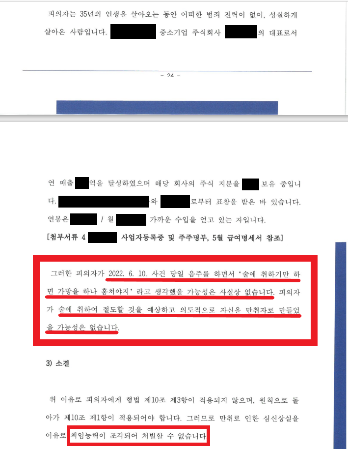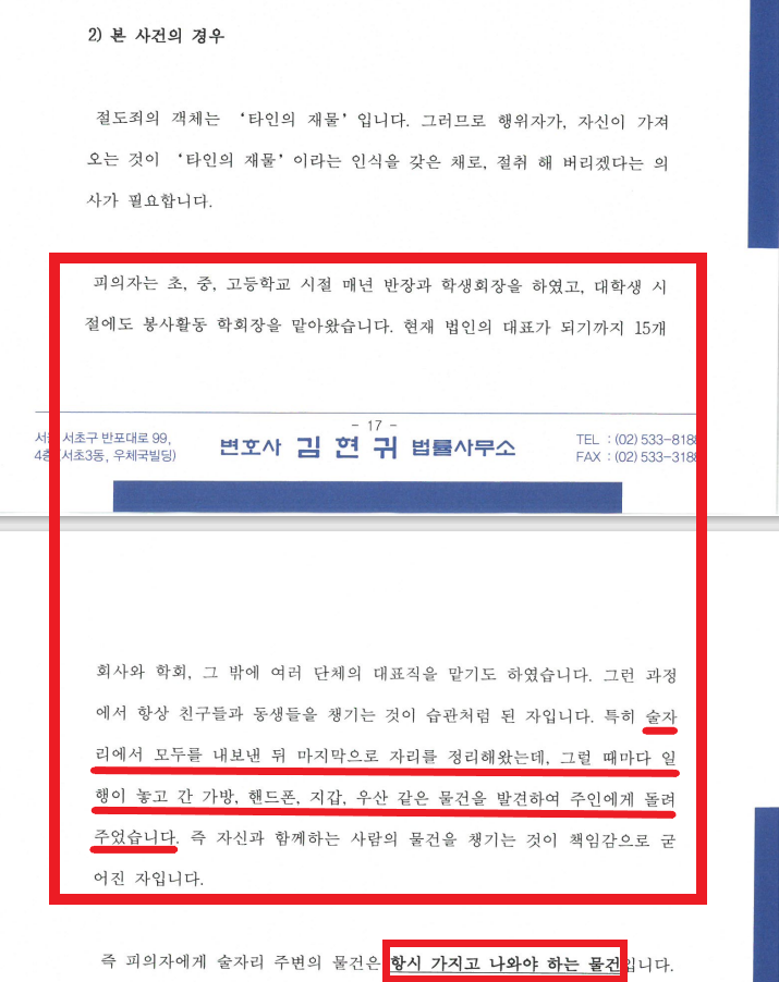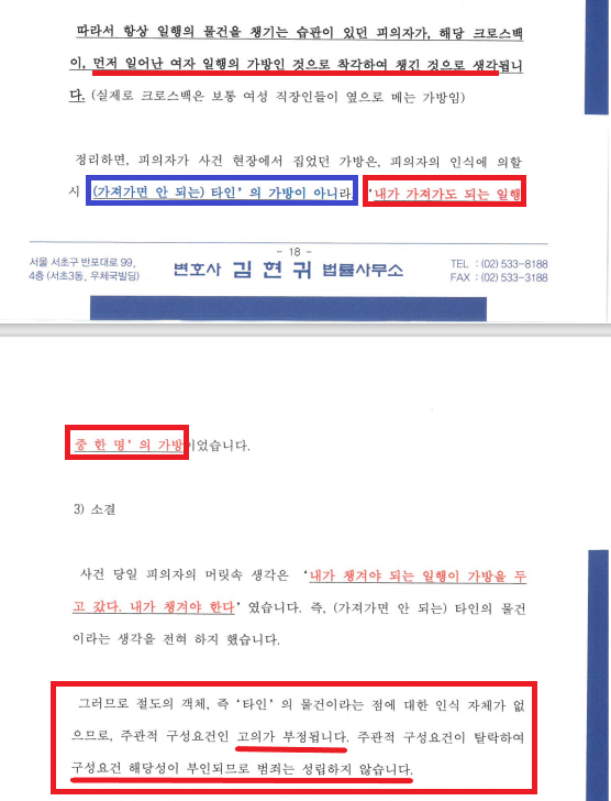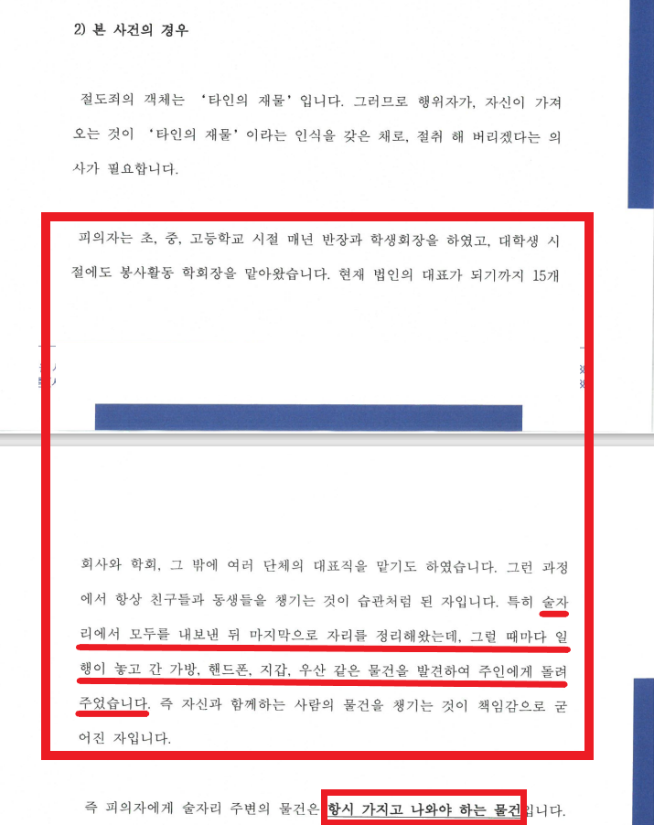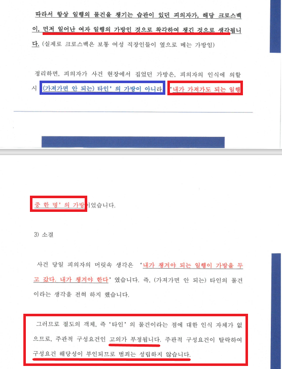 아무런 전과도 없고, 경제적으로도 풍족한 A가 다른 사람의 가방을 가져온 것은 - 아마도 만취한 상태에서, 옆자리의 토드백을 '내 여성 직원 중 한 명이 가져온 건데 두고 갔구나'라고 생각했기 때문일 것입니다. (마침 A가 술집에서 나갈 때, 옆 테이블 여성은 담배를 피러 나가서 자리에 없었음) 사정이 이렇다면 A에게 절도의 고의와 불법영득의사는 없습니다. 이러한 점을 의견서에 적극 주장하였습니다.