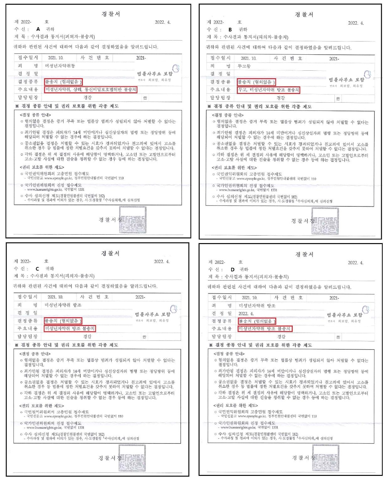 결국 수사기관은 최보람 변호사의 주장을 적극 반영하여 A, B, C, D 모두에 대해 불송치(혐의없음) 결정했습니다.