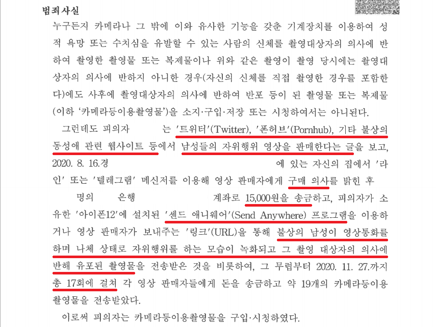 성소수자 A씨는 2020. 8. 16.경부터 2020. 11. 17.경까지 '트위터(twitter)', '폰허브(pornhub)', 기타 동성애 관련 사이트 등에서 알게 된 음란물 판매자들로부터 남성이 영상통화를 하며 나체 상태로 자위행위를 하는 모습이 녹화된 '제2의 N번방' 불법 촬영물을 총 17회에 걸쳐 구매하였습니다.