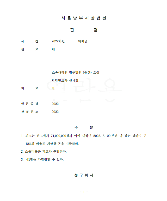 저는 즉각 민사소송을 제기하여 대여사실을 기타 정황증거로 주장 입증하였고 법원은 저희의 주장을 모두 받아들여 전부 승소를 선고하여 의뢰인은 대여금을 돌려받게 되었습니다.
