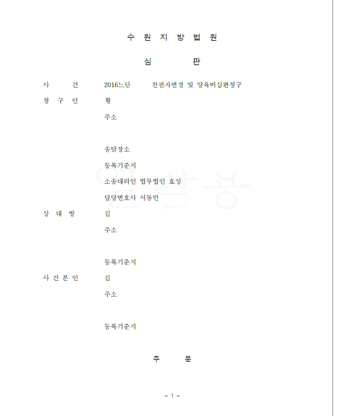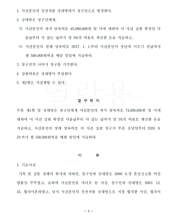 저는 친권자를 의뢰인으로 변경하고 상대방이 지급하지 않는 과거 양육비를 일시 청구, 사건본인이 성년에 달할 때까지의 장래 양육비를 재판상 청구하였고 법원은 저희의 주장을 받아들였습니다.