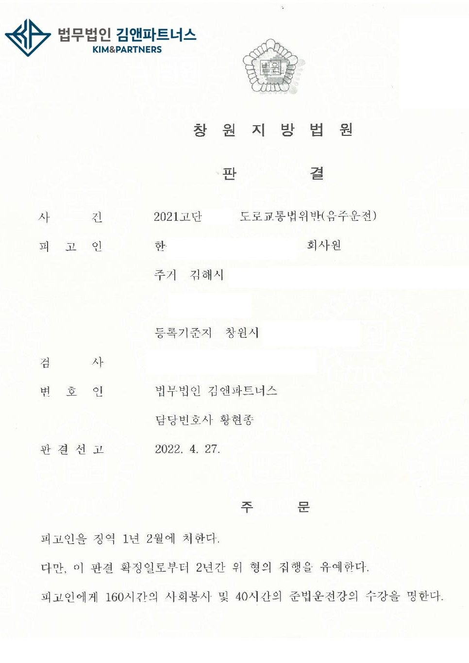 황변호사는 최근 창원지방법원에서 도로교통법위반(음주운전) 사건을 담당하여 집행유예 판결을 받았습니다.