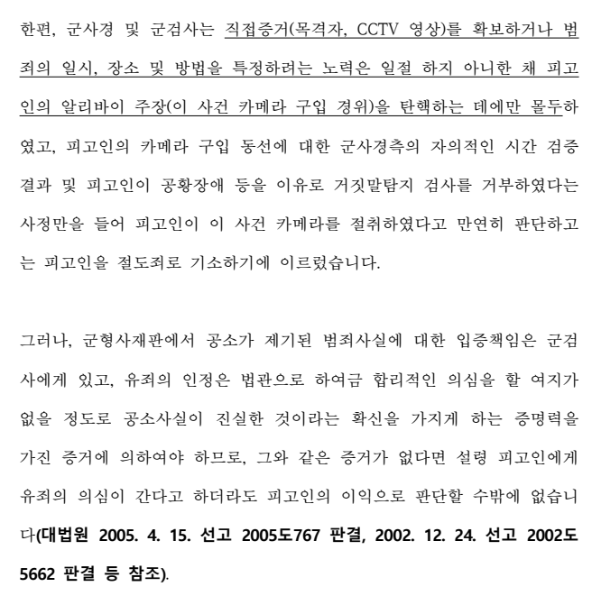 위와 같이, 변호인이 공판진행의견서 등 다양한 서면을 통하여 1) 의뢰인께서는 중고거래를 통하여 이 사건 카메라를 구입하였을 뿐 이 사건 카메라를 절취한 사실은 절대 없으며, 2) 군검사가 제출한 증거만으로는 의뢰인께서 이 사건 공소사실과 같은 절도 범행을 범하였다고 인정하기에 부족할 뿐만 아니라 3) 심지어 군검사가 제출한 증거에 의하여서는 범죄의 일시, 장소와 방법조차 정확하게 특정되지 아니하였다는 점 등을 구체적으로 주장, 입증한 결과 보통군사법원은 의뢰인에게 불리한 정황 증거가 다수 존재하였음에도 불구하고 위와 같은 변호인의 주장을 거의 그대로 받아들여 판결문에 이를 인용하면서 의뢰인에게 "무죄"를 선고하였습니다.