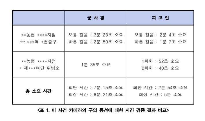 이에, 변호인은 1) 공판진행의견서를 통하여 '군수사기관은 목격자나 CCTV 등 직접증거를 확보하거나 범죄의 일시, 장소 및 방법을 특정하려는 노력은 전혀 하지 아니한 채 오로지 피고인의 알리바이 주장을 탄핵하는 데에만 몰두하였고 그 결과 공소가 제기된 범죄사실에 대한 충분한 입증을 하지 못한 상태에서 만연히 기소에 이르렀다'는 점을 강조하였고, 2) 나아가 군수사기관이 제출한 가장 중요한 증거인 카메라 구입 동선에 대한 군경찰의 시간 검증 결과를 탄핵하기 위하여 카메라 구입 동선에 대한 피고인측의 시간 검증 결과를 증거제출서와 함께 제출함으로써 '군경찰측의 시간 검증 결과를 전혀 신빙할 수 없다'는 점을 역설하였습니다.