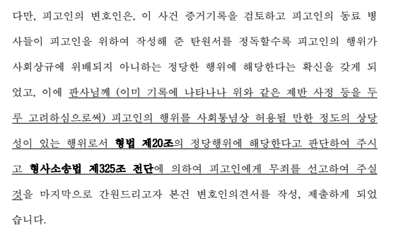 또한, 본 변호인은 공판이 종결된 후에도 군사법원에 추가 의견서를 제출함으로써 '의뢰인이 업무 관련 지적 중 자로 피해자를 툭툭 치거나 소위 '상향식' 도중 피해자에게 "죽여버린다"는 발언을 한 것은 사실이나, 이와 같은 의뢰인의 행위는 사회통념상 허용될 만한 정도의 상당성이 있는 행위로서 형법 제20조의 정당행위에 해당한다'는 점을 강력하게 피력하였습니다.