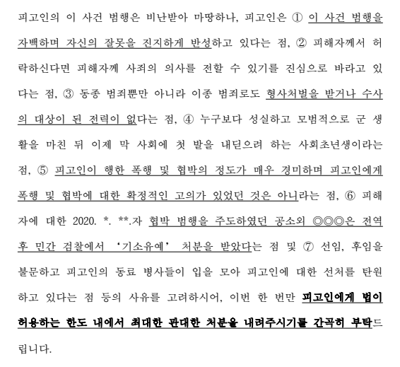 본 변호인은, 반성문, 감사장, 부대원들이 작성해 준 롤링페이퍼 및 탄원서 일체 등 각종 양형자료와 함께 ① 의뢰인께서 누구보다 성실하고 모범적으로 군 생활을 마친 뒤 이제 막 사회에 첫 발을 내딛으려 하는 사회초년생이라는 점, ② 의뢰인이 행한 폭행 및 협박의 정도가 매우 경미하며 의뢰인에게 폭행 및 협박에 대한 확정적인 고의가 있었던 것은 아니라는 점, ③ 피해자에 대한 협박 범행을 주도하였던 다른 가해자는 전역 후 민간 검찰에서 기소유예처분을 받았다는 점, ④ 의뢰인의 동료 병사들이 입을 모아 의뢰인에 대한 선처를 탄원하고 있다는 점 등의 구체적인 양형사유를 기재한 공판진행의견서를 군사법원에 제출하면서 '의뢰인에게 법이 허용하는 한도 내에서 최대한 관대한 처분을 내려주시기'를 판사님께 간원하였습니다.